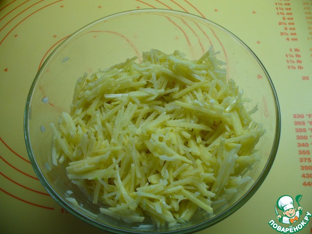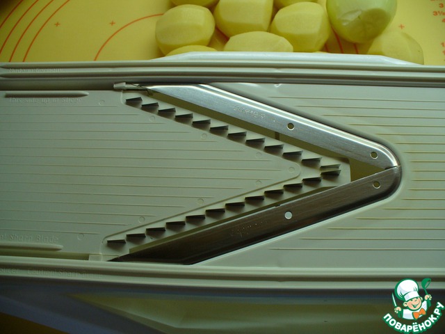 Берем шинковку, на которой обычно трут морковь для корейского салата, и натираем картошку и лук на этой шинковке.