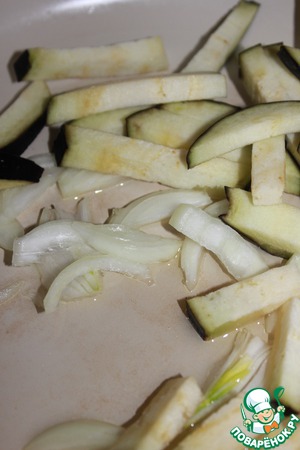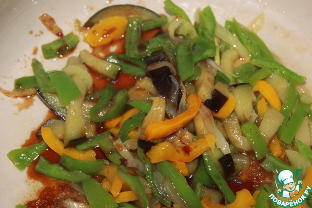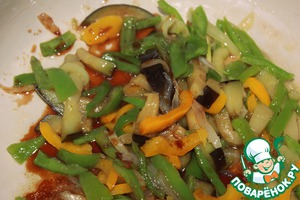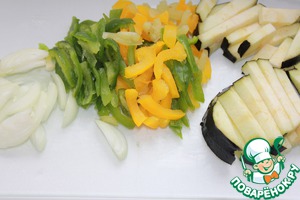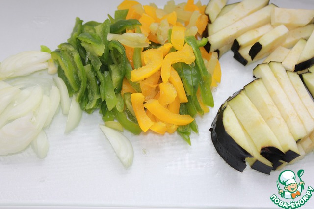 Овощи нашинковать - баклажан брусочками, Перцы и лук соломкой. -