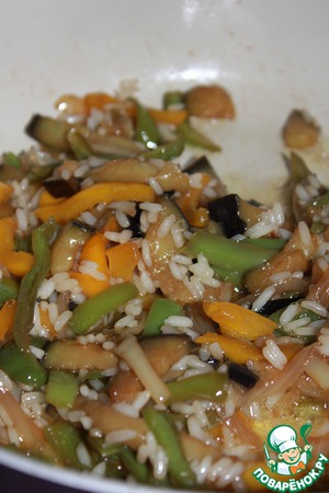 Затем сразу рис и жарить еще минуты 2, Не забывая при этом тщательно все перемешивать.