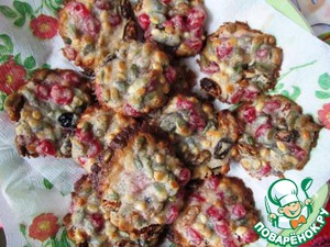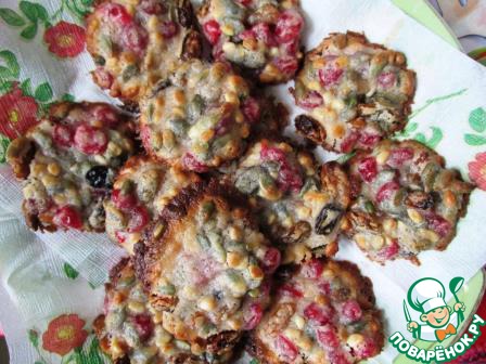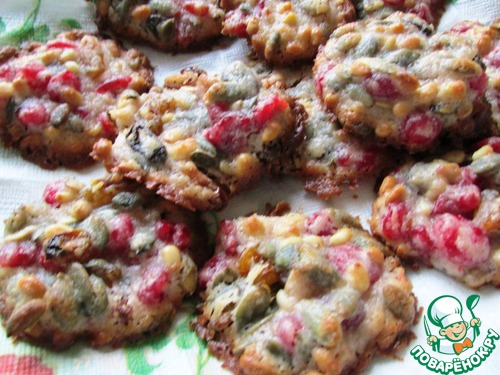 Очень меня заинтересовал этот рецепт, печенье почти без муки. На сайте есть два рецепта флорентийского печенья, но они более сложные и ингредиенты там другие. Честно говоря, очень сомневалась в результате. И напрасно! Плотное, но хрупкое, сладкое печенье с насыщенным вкусом кедровых орехов и жареных тыквенных семечек. Кусочки вяленой вишни придают еле ощутимую, но приятную кислинку.
