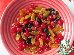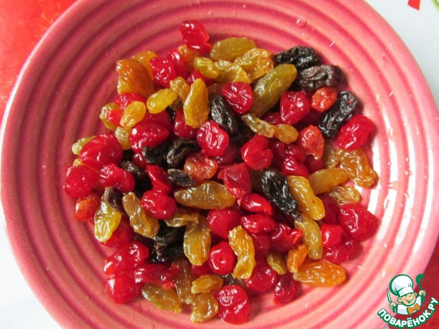Изюм и вишню хорошо промыть в нескольких водах. Откинуть на сито. Положить в миску и залить столовой ложкой коньяка или рома.