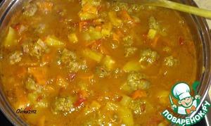 Лук репчатый мелко режем и пассеруем на растительном масле, добавляем порезанную кубиками морковь. Томаты в собственном соку (у меня были они или томатный сок) измельчаем блендером до состояния пюре. Добавляем на сковороду к овощам и провариваем на медленном огне. А тем временем... Фарш беру чайной ложкой, делаю из него шарики и кладу на сковороду к овощам. Делать это надо быстро или заранее... :-) Провариваем наш соус с мясными шариками. Кольца консервированного ананаса режем кубиками и добавляем в соус. Провариваем ещё минут 5. Затем солим, перчим, добавляем измельченный чеснок, смесь итальянских трав. Выключаем наш соус и даём ему настояться :-)