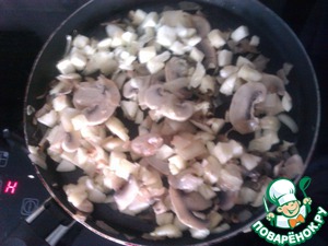 1. Обжарим слегка на оливковом масле (или любом другом) чеснок, лучок - пару минут до приятного аромата, добавим порезанные на пластинки шампиньончики. Я решила, что не хочу сильно зажаривать и добавила немного вина (застоялось в холодильнике), протушила на среднем огне.