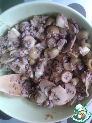 Смешаем микс со сковородки, с блендера и добавим порезанные на кружочки оливки, 1/3 потертого сыра. Анчоусов не нашла из рецепта по-лигурийски, думаю они придадут свою пикантность. Но насколько я знаю, анчоусы очень соленые, мне мой вариант микса (тунец+каперсы) и так показался достаточно соленым, поэтому даже не знаю стоит ли просто с анчоусами рисковать..