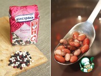 Для приготовления этого блюда нам понадобится фасоль - я выбрала микс ТМ Мистраль. Замачиваем 100гр фасоли в холодной воде на ночь, а утром промываем и отвариваем в не очень большом количестве воды (фасолевый бульон далее будем использовать в солянку).