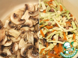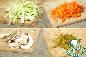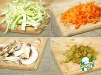 Пока варится фасоль, подготовим овощи: капусту нашинкуем, морковь потрем на крупной терке, шампиньоны порежем пластинками, а соленые огурцы кубиками среднего размера. |