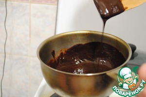 Разломайте шоколад на мелкие куски и вместе со сливочным маслом растопите. Растапливайте по своему усмотрению: в микроволновой печи, на паровой бане, просто на медленном огне. Я выбрала последний способ.