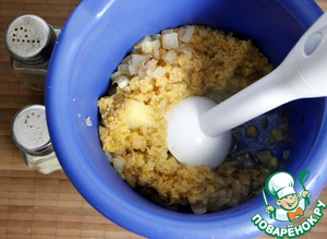 Взбить миксером картофельно-чечевичную смесь с жареным луком, посолить и поперчить.