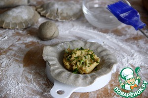 От теста отрываем кусочки, величиной с грецкий орех, тонко раскатываем, выкладываем в форму для вареников, сверху - начинку и немного зелёного лука. Края смазать влажной кисточкой, смоченной в воде.