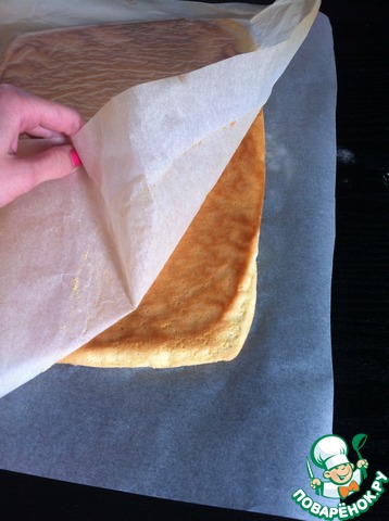 Для того, чтобы было удобно сворачивать рулет, можно отрезать такого же размера бумагу для выпекания и положить на стол. Аккуратно достать готовый бисквит и перевернуть его на подготовленную бумагу. Снять верхнюю, она немного прилипнет.