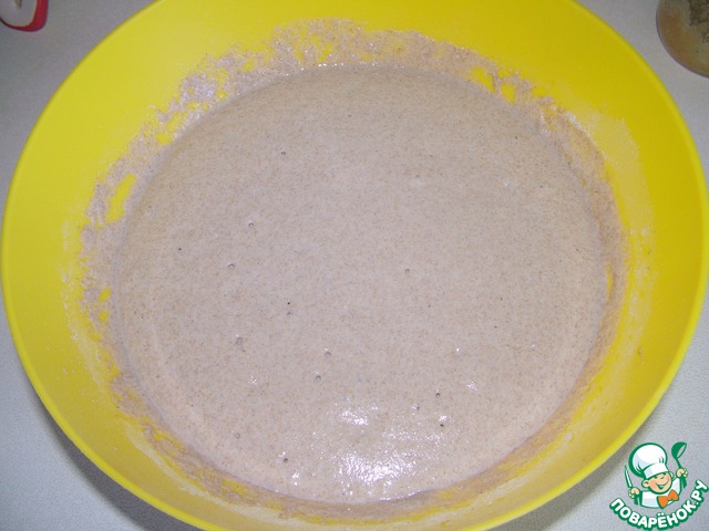 Очень хорошо размешать, чтобы не было комочков, накрыть пленкой и поставить в теплое место (30С) для созревания опары на 3 часа.