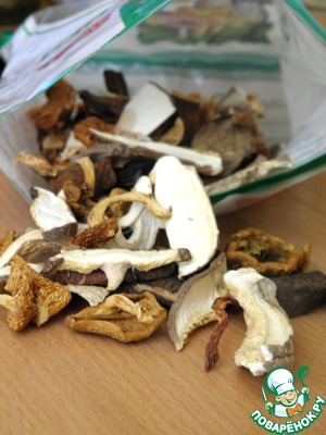 Сушеные грибы у меня магазинные. Их нужно замочить в воде на 1час, а потом залить 1л. чистой воды и варить 1,5-2часа.