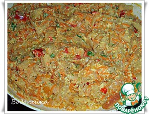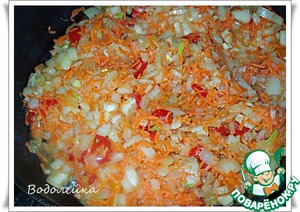 Нарезаем лук кубиками, перец-небольшими полосочками, а морковку трем на терку и обжариваем на растительном масле до готовности. -