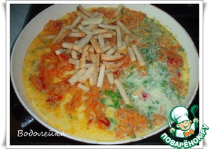 После чего добавляем горсть сухариков и заливаем взбитым яйцом с молоком и рубленной зеленью, слегка солим и обжариваем пару минут, при постоянном помешивании.