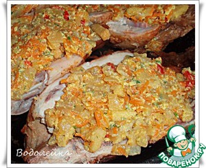 Кладем внутрь каждой половинки курицы приготовленную овощную смесь.