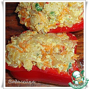 Если овощная начинка у вас осталась, можно нафаршировать ею перцы, посыпать сыром и поставить в духовку вместе с курочкой.