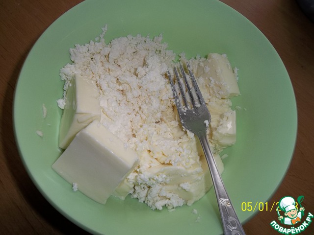 Очень удобно разминать творог с плавленным сыром вилкой.