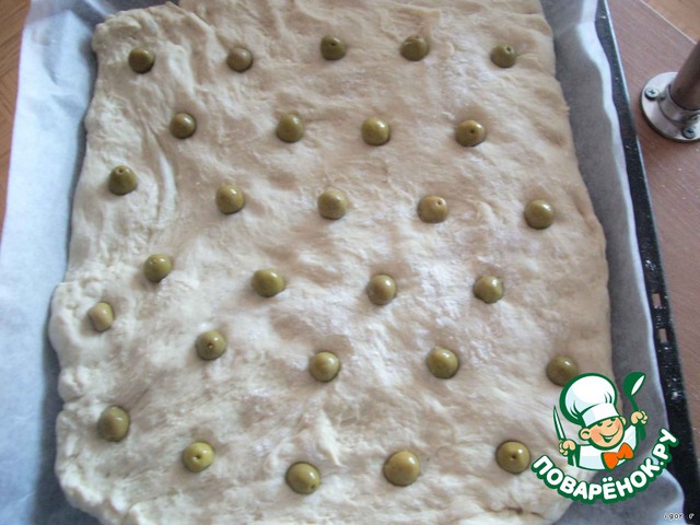 Через час тесто сильно поднялось, я его достал и руками растянул на противень. Воткнул оливки. -