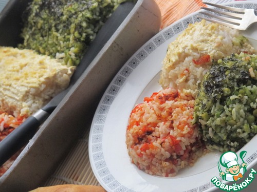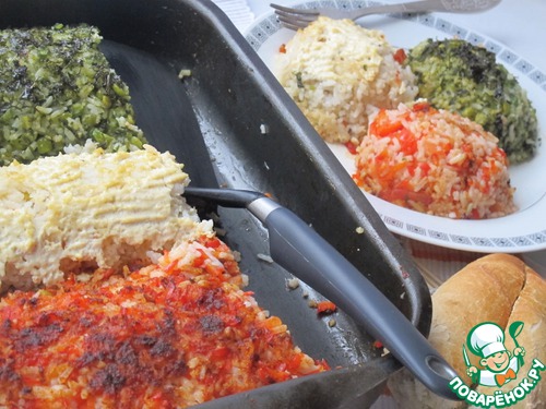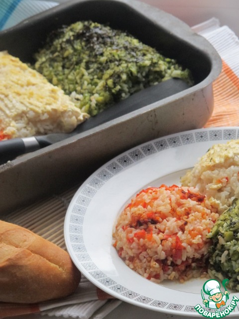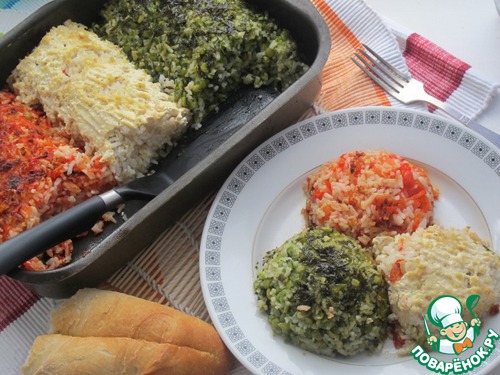 Противень смажьте раст. маслом, выложите подготовленный рис красным, белым и зеленым валиками. |