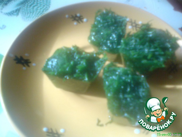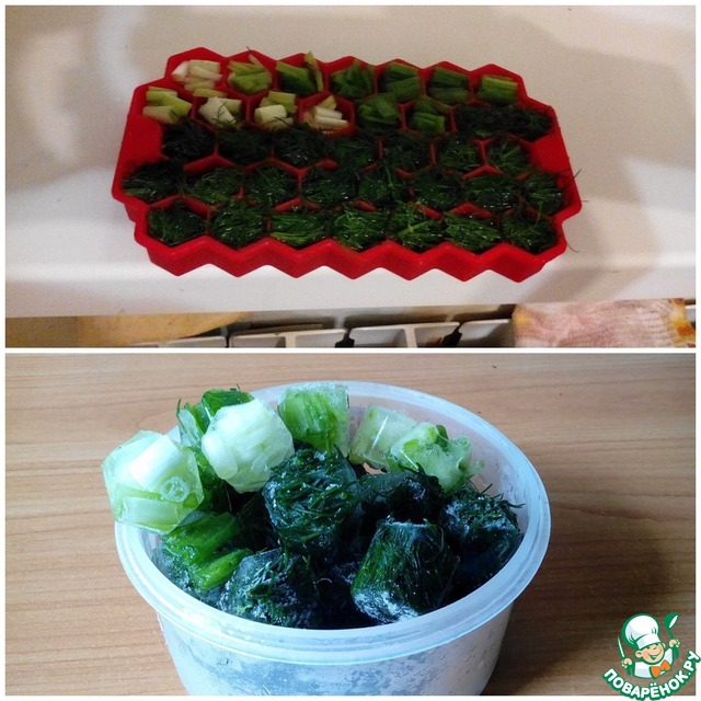 Получились вот такие ароматные кубики. Складываем их в емкость для хранения заморозки (в целлофановый пакетик нежелательно). В любой момент можно достать кубик и использовать - в супах, борщах, соусах, подливах...