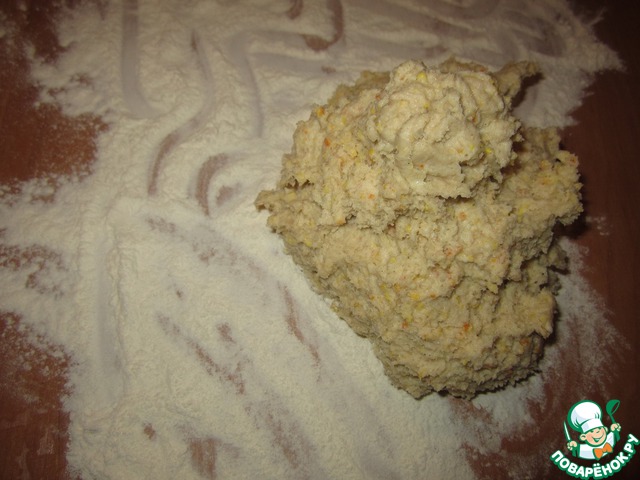 На рабочую поверхность высыпаем примерно стакан муки и выкладываем тесто. Снова вымешиваем тесто, смотрим, сколько оно еще взяло в себя муки, и добавляем еще, если это необходимо.