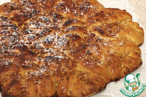 Для серединки оставшийся кусочек теста раскатать в овал, смазать джемом, свернуть рулетом и сформировать улитку, сделать сверху надрезы, переложить в центр пирога. Дать пирогу хорошенько расстояться (не менее 1 часа!). Приготовить смесь для смазывания верха: растопить мед и смешать с растительным маслом, смазать верх пирожка, выпекать в духовке до готовности. За 20 минут до окончания выпечки смазать пирог еще пару раз, посыпать кедровыми орешками.