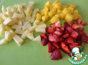 Чистим фрукты, нарезаем их кубиками. У ананаса не забываем вырезать жесткую сердцевину.