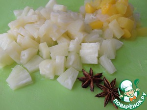 Консервированные фрукты следует порезать кусочками. Бадьян - растолочь в ступке.