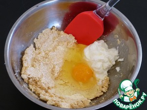 Добавить яйцо, сметану, щепотку соли и хорошенько перемешать.