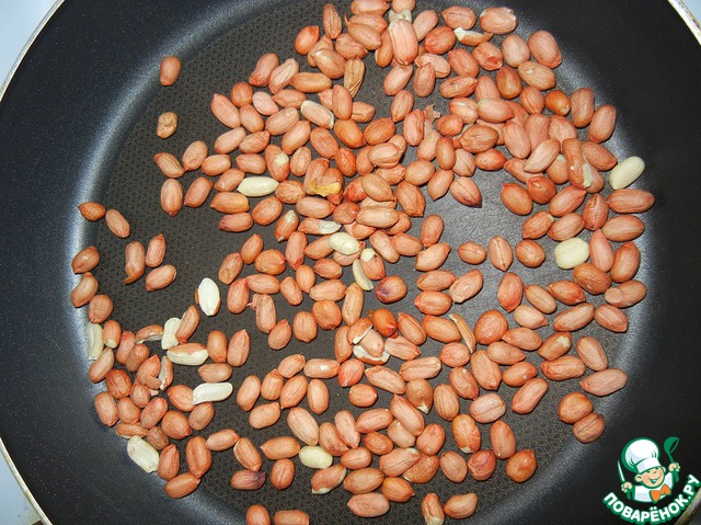 Поджариваем арахис, постоянно помешивая. Это можно сделать и в микроволновке, время приготовления будет зависить от мощности Вашей помощницы. В широкую тарелку насыпаем арахис в один слой и жарим около 1- 1,5 минут при мощности 650Квт, затем перемешиваем и еще на 1-1,5 минут. Достаем из печки, ждем пока остынет и очищаем. Как быстро очистить арахис? Есть отличный совет http://www.povarenok .ru/advice/show/149/ Возможно этот совет кому-то пригодится.