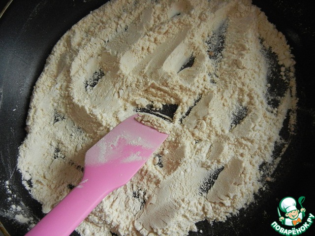 Муку обжариваем на сухой сковороде, постоянно помешивая, чтобы не подгорела. Жарим до тех пор, пока мука не приобретет приятный кремовый оттенок.