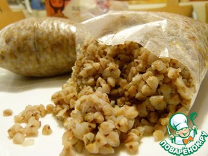Ставим вариться нашу ядрицу как указано на упаковке - положить в кипяток пакетики и варить 20 минут до готовности. У, как они разбухли, кашка так и вываливается, зернышко к зернышку! Можно использовать гречневые хлопья - залить кипятком и дать настояться.