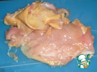 Обрежем с курицы все мясо. У меня была домашняя курочка и в дело пошла вся мякоть вместе с кожей и жиром, получилось где-то 1 кг. Если Вам слишком жирно и шкурно, берите филе грудок. |