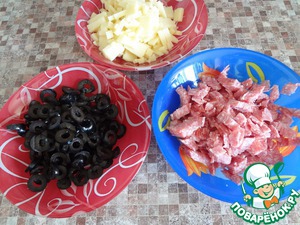 Салями, оливки и сыр нарезать на маленькие кусочки.