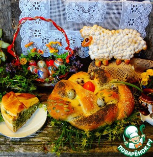 В этот год моя семья впервые будет праздновать Пасху с итальянскими пирогами. Надеюсь, завтра я ещё успею испечь наши куличи и сделать пасху. Но уже сейчас можно сказать, что праздник у нас удался. Два пирога и один сладкий хлеб - это уже хорошее застолье. Я не стала всё в один рецепт соединять, а сделала три рецепта. У нас ещё много чего будет, но к сожалению, не вошло на эту фотографию. Послезавтра и стол раздвинем, и закуски ещё поставим!!! Вот, что у меня получилось на итальянский лад. Посмотрите, как красиво, ярко и весело мы будем встречать самый главный праздник ВЕСНЫ!
