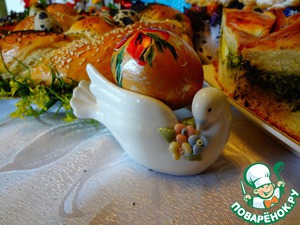 Украшаем наш праздничный стол первыми весенними цветами и травкой. Ставим на стол главное украшение - корзину с крашеными яйцами и наши пироги. Приглашаем гостей и начинаем праздновать.