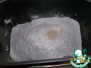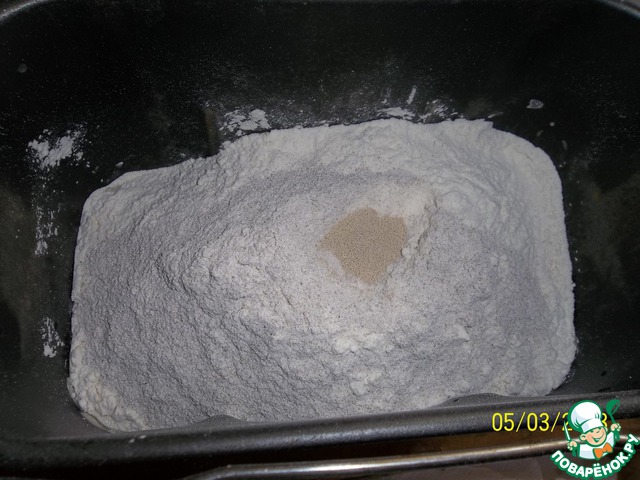 • Выложите ингредиенты в контейнер, согласно инструкции к вашей хлебопечке. Выбираем программу, которая длится не менее 3-х часов 30 минут. У меня это 5-я программа (французская булка).