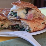 • Затем выложить начинку слоями. Первый слой у меня - шпинат, но в следующий раз начну с грибов. Шпинат немного увлажнил нижний слой теста. Хотя на вкус это не повлияло.