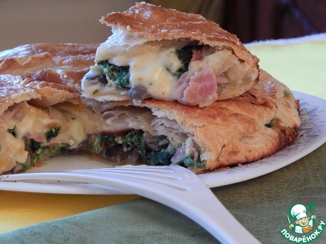 Чудесный пирог! Такая гамма вкуса, так ненавязчиво переходят слои, дополняя и насыщая друг друга в обрамлении хрустящего золотистого теста! Очень понравился! Делала полпорции, на упаковку слоённого теста 265 г, хотя грибы пожарила 400 г ( коричневые шампиньоны). Шпинат брала замороженный, в сливки добавила яйцо - вкуса омлета не наблюдалось.