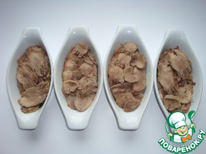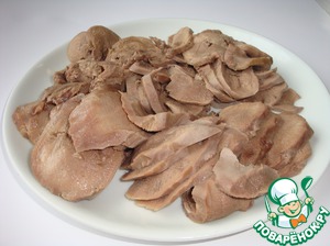 Отмерить 500 граммов языка и нарезать тонкими ломтиками.