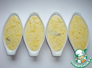 Залить содержимое формочек соусом и присыпать оставшимся сыром.