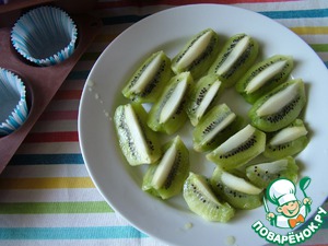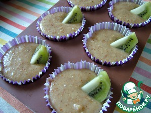 Разложите тесто в формочки, в каждую добавьте по кусочку киви.