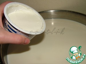 Затем ставим кастрюлю в горячую воду и начинаем мешать сыр. Температура должна подняться до 40-42*С.