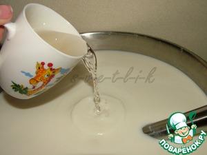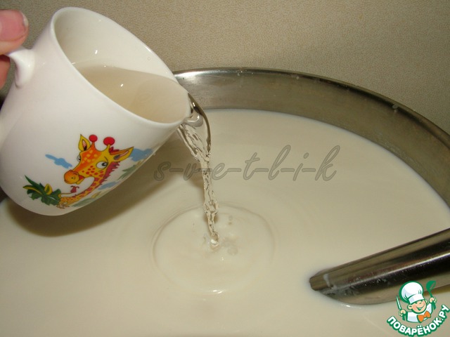 Фермент Мейто (я заказываю его через интернет) разводим в половине стакана прохладной кипяченой воды. 1 пакетик рассчитан на 100 литров молока, поэтому я на 12 литров использую примерно 1/5 часть пакетика. Меньше - может не свернуться, больше - не страшно.