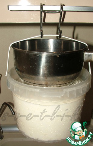 В подвешенном состоянии ковшик давит на сыр и сыворотка хорошо отделяется и стекает вниз.