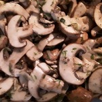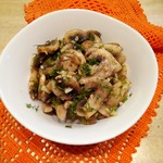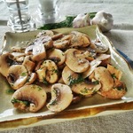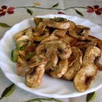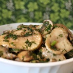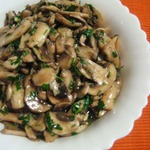 За это время нужно разогреть масло на сковороде, бросить в него расплющенный зубчик чеснока, зажарить его до румяности, вынуть и выбросить – в готовом блюде он нам не понадобится, а полученное таким образом ароматное масло сразу же, горячим, вылить в миску с грибами и быстро перемешать.