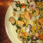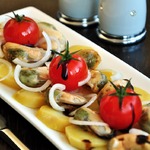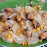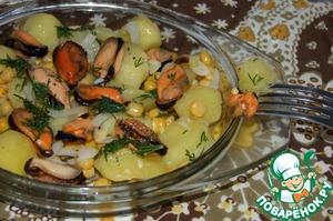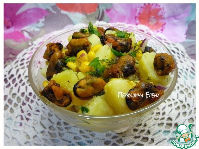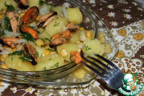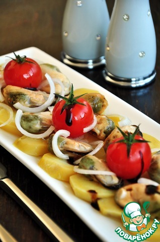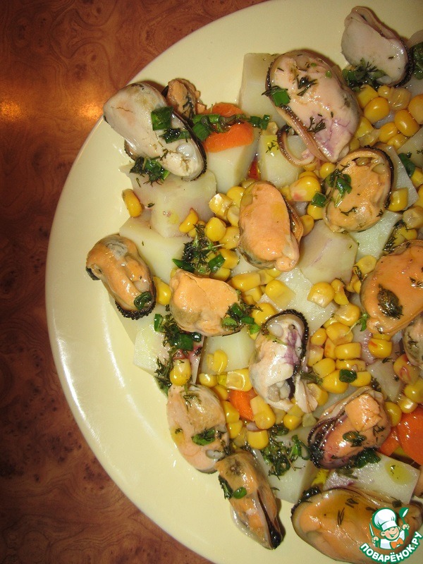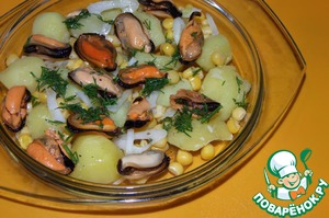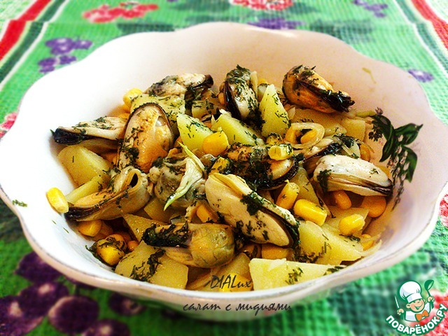 Далее очередь мидий – их нужно просто разложить поверх салата в хаотичном порядке.