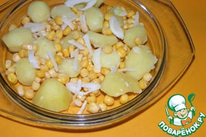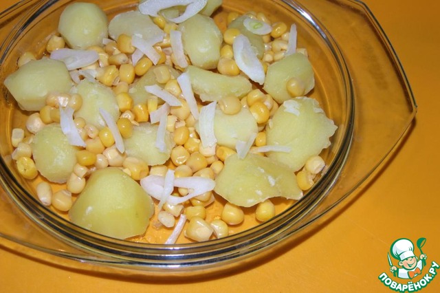 Добавить к нему кукурузу без жидкости и тонко нарезанный лук.
