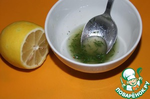 Приготовим соус: для этого смешаем оливковое масло, лимонный сок, немного соли, свежемолотого перца и мелко нарезанный укроп.