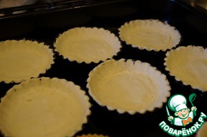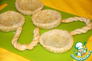 Формочки смазываем растительным маслом. Выкладываем в формочки кружки из теста. Из остатков теста делаем ручки для корзинок: Полоски теста изогнуть дугой и положить на противень. Отправляем все в духовку разогретую на 200 градусов на 10-15 минут.
